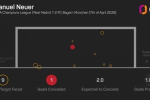 欧冠淘汰赛客战皇马做出9次扑救,诺伊尔是有统计以来门将首人