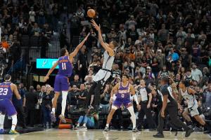 但关键时刻太阳前锋弗莱明两罚不中,给马刺留下10.4秒的时间。文班亚马拿到球后不慌不忙,连续假动作找准机会,运一步直接干拔出手,皮球应声落网,马刺101-100反超太阳。